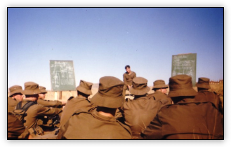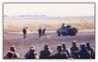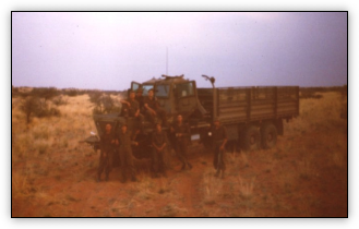 We spent the next few weeks driving around the Kalahari Desert in huge convoys practising desert driving, vehicle camoflage and doing countless "Visgraat" exercises under simulated MiG attack conditions. We were lived on RatPacks and weren't allowed to wash or shave or use deodorant. The reason for this, we were told, is because if you use soap, the enemy can smell you a mile away.