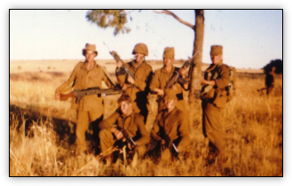 The rifle range consisted of mounds divided into 100 meter sections that went back to 1000 meters. Opfok at the rifle range meant running with an empty ammo crate up and down the course, and I guess everyone had a turn at doing this. The R4 was an amazing rifle, with almost no recoil at all, and we were subsequently taught to shoot standing, sitting, kneeling and lying at distances of 100 meters onwards. I was pretty good at shooting because when I was still at school we used to live on a farm and I did a lot of shooting in those days. I went on to earn my Skietbaaltjie, an award that we were allowed to sew onto our shirts to indicate that we were marksmen. This carried a certain amount of prestige with it of course. During our tea breaks at the shooting range we would remove the projectiles off bullets and pour loads of gunpowder down the many termite holes in the terrain. Once ignited, clouds of black smoke and sparks came shooting out of interconnected holes all around us. Boys will be boys!!