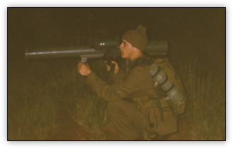 I still have my original notebook and it certainly makes interesting reading, especially the part on platoon weapons, my favorite subject. During this time we were taught how to operate the belt-fed LMG, the Beretta pump-action shotgun, the 60mm patmor (a light patrol mortar), the Meerkat, a 40mm multi-shot grenade launcher with occluded sight, the French 89mm rocket launcher (see equipment page), and last but by no means least, the Russian made RPG7. The latter was of course part of the huge caches of weapons captured by the SADF in successful cross-border operations, and I remember how interesting the ammo cases were as the writing on them was all in Russian.