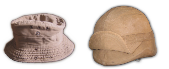 | The headgear used in the SADF was optimized for use in the South African bush. The floppy bush hat (left) helped keep the sun out, and also particularly noticible is the sun-flap on the nutria helmet cover. The form and proportions of the helmet resemble that of the old pith helmet used by British colonial forces |